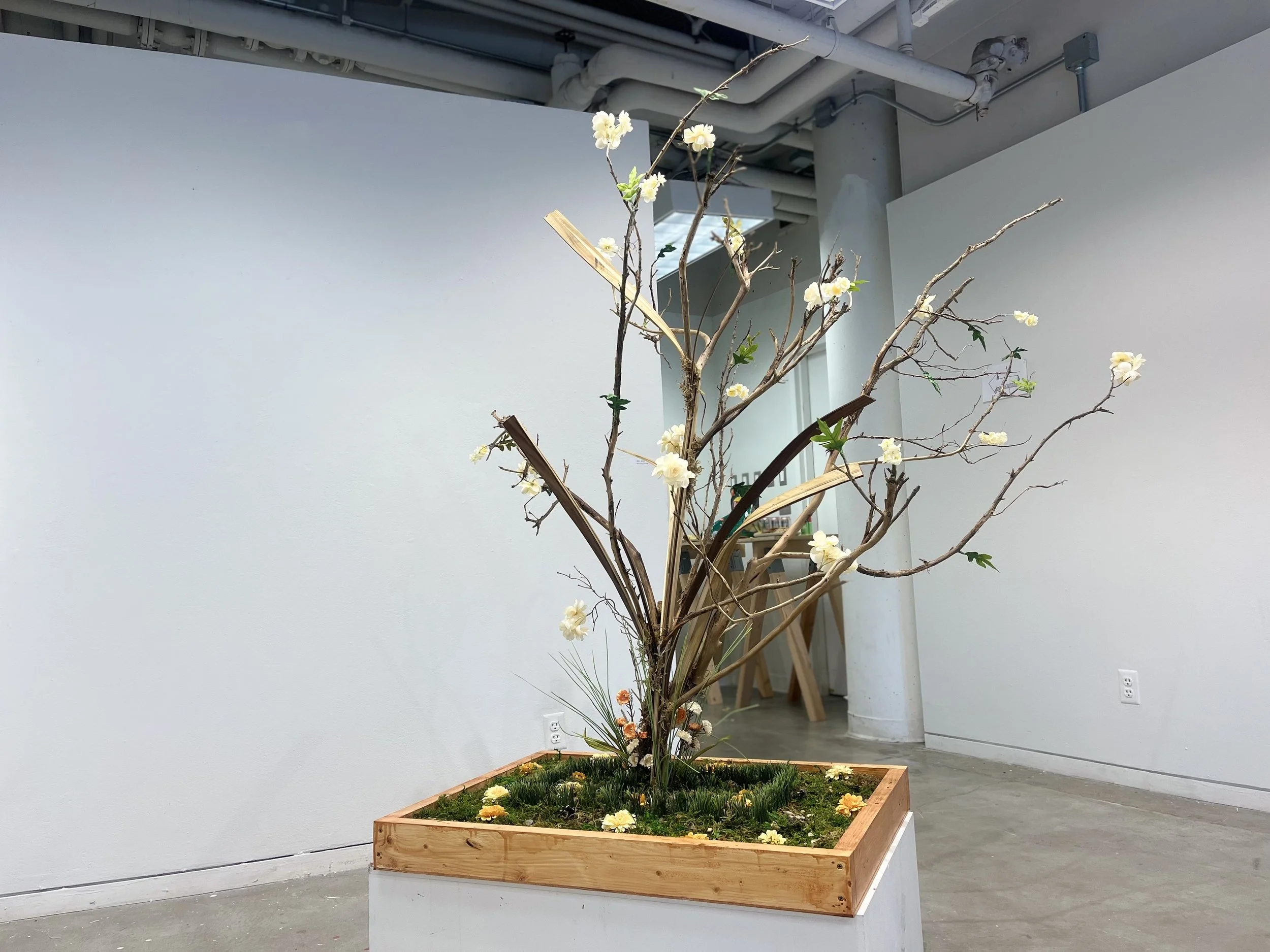 Oak Planks, plywood, cedar branches, moss, artificial grass, artificial flowers, flower foam