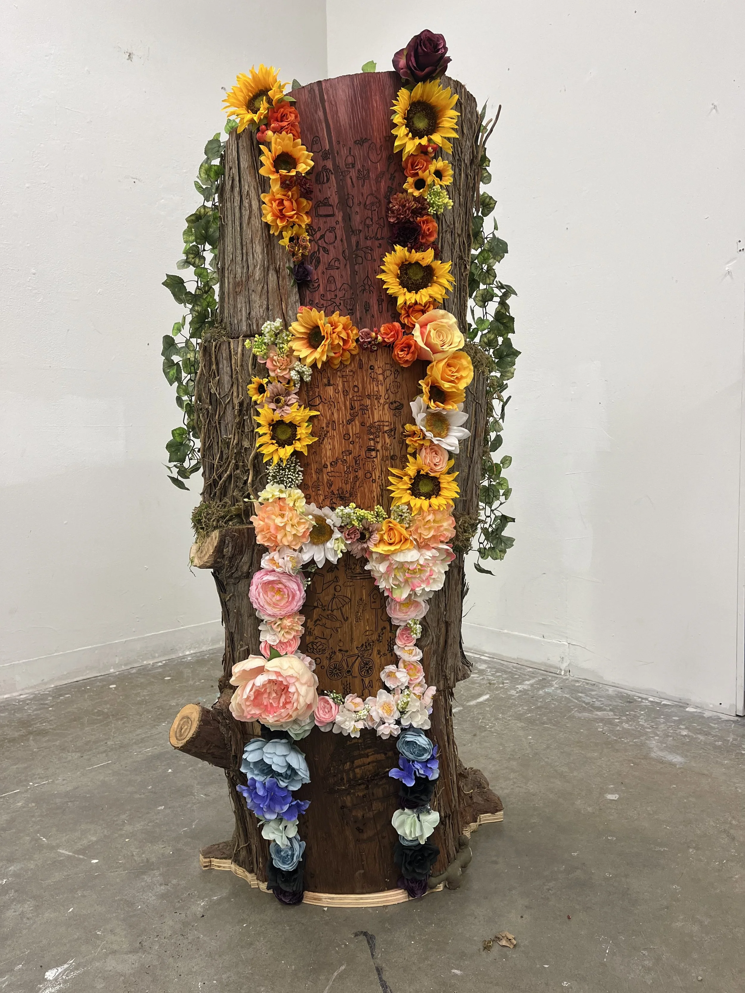 Dead cedar logs, moss, artificial flowers, spray foam, PVC pipe, plywood, acrylic paint